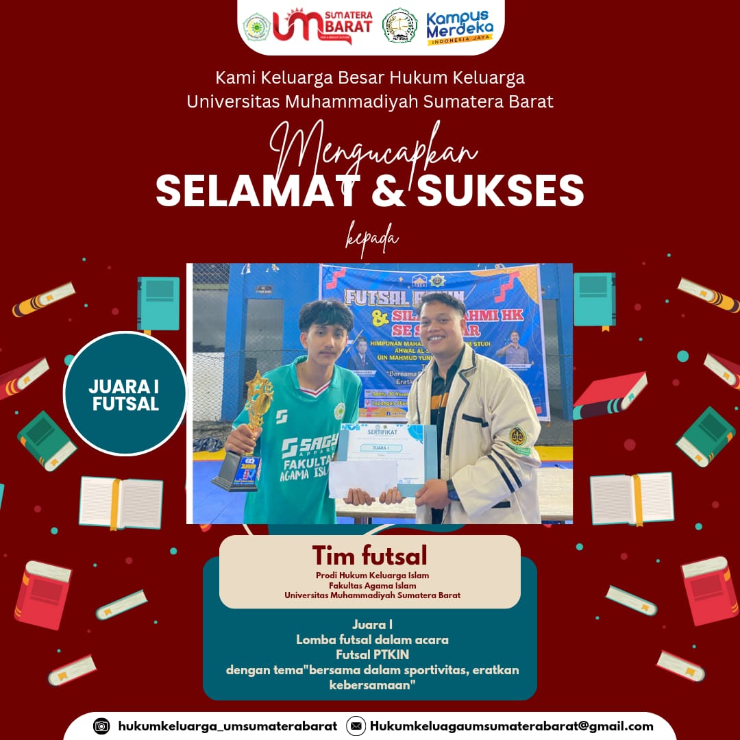 Selamat dan sukses kepada Mahasiswa Program Studi Hukum Keluarga merqaih juara I pada turnamen Futsal pada acara Futsal PTKIN dengan Tema " Bersama Dalam Sportivitas, Eratkan Kebersamaan". yang di adakan di UIN Mahmud Yunus Batusangkar.
